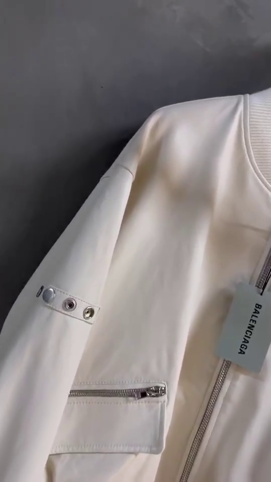 Cream down jacket.Comfortable woven sleeves.Full front zipper and side pockets.Sizes: S, M, L.Includes label.